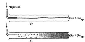 Различные режимы течения жидкости можно проследить, вводя в поток подкрашенную струйку жидкости.