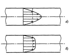 | Рисунок 8 – Схематичное изображение ламинарного (a) и турбулентного (b) течения в плоском слое | Рисунок 9- Сопоставление формы профиля скорости ламинарного (а) и турбулентного течения. Вертикальная пунктирная линия – эпюра средней по сечению скорости. |