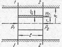 Движение слоя происходит под действием разности сил давления Р1 и Р2 с обеих торцевых сторон цилиндра: