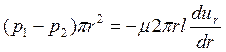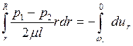 Переходя ко всему объему жидкости в трубе, проинтегрируем это дифференциальное уравнение, учитывая, что радиус в левой части уравнения изменится от rдо r=R, а переменная скорость в правой части – от u=ur до u=0 (у стенки, где r=R).