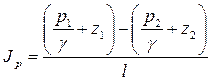. Проведя между сечениями 1-1 и 2-2 линию р-р по верхним точкам пьезометрического напора, получим так называемую пьезометрическую линию, которая показывает изменение пьезометрического напора по длине потока. Если расстояние между сечениями но длине потока равно l, то можно получить изменение пьезометрического напора на единицу длины потока. Обозначив эту длину Jp, называемую средним пьезометрическим уклоном на данном участке, получим: