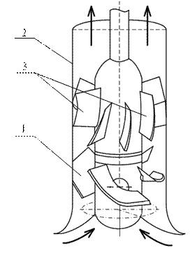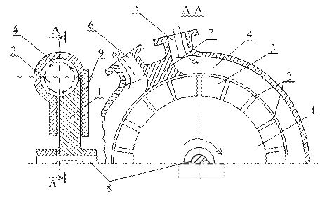 патрубок; 7 – разделитель потоков; 8 – вал рабочего колеса; 9 – корпус
