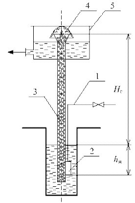 Эти насосы чаще называют эрлифтами или газлифтами. Они состоят (рисунок 3.21) из вертикальной подъемной трубы 3,погруженной под уровень перекачиваемой жидкости, линии 1 подачи газа (обычно воздуха) с распределителем (барботером) 2, с помощью которого газ в виде пузырьков поступает в трубу 3. Плотность образующейся при этом газожидкостной смеси ρсм значительно меньше плотности жидкости ρж, в результате чего смесь поднимается по трубе 3 над уровнем жидкости на высоту Н т.На выходе из трубы при ударе об отбойник 4 газожидкостная смесь разделяется: воздух выделяется, а осветленная жидкость поступает в сборник 5.