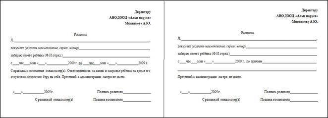 Вне территории отряда с отъездом домой на ночь или более, при этом расписка должна быть написана родителями или законными представителями на имя директора ДОЛ с указанием причины отъезда и подписано им. Данное заявление с резолюцией руководителя смены или зам.директора по ВР хранится у зам.директора по ВР до возвращения ребенка из отпуска.
