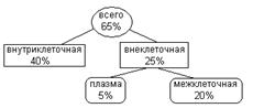 Особенностью химического состава внутриклеточной жидкости является высокое содержание калия и белков. Внеклеточная жидкость содержит более высокие концентрации натрия. Значения рН внеклеточной и внутриклеточной жидкости не различаются. В функциональном отношении принято выделять свободную и связанную воду. Связанная вода – та её часть, которая входит в состав гидратных оболочек биополимеров. Количество связанной воды характеризует интенсивность обменных процессов.
