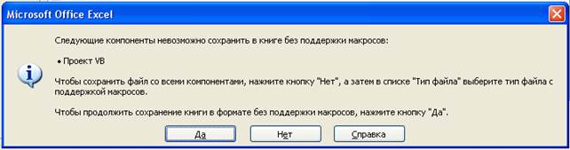 Это означает, что макрос нельзя сохранять на диске в обычном файле документа Excel. Файл Excel, хранящий макрос, следует записывать, выбрав тип файла "Книга Excel c поддержкой макросов".