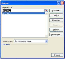 Для запуска на выполнение только что написанной (или загруженной с диска) программы вызываем диалоговое окно "Макросы". Для этого нажимаем ALT+F8 или закладку "Вид", кнопка "Макросы". В окне "Макросы" кликаем по имени программы (в нашем примере она называется Program_1) и нажимаем кнопку "Выполнить".