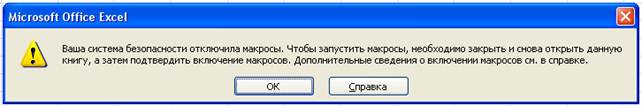 Здесь нас ждёт неудача – Excel воспротивится запуску макроса и сообщит, что система безопасности отключила макросы.