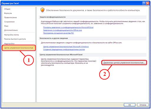 На экране появится окно "Параметры Excel", в котором надо выбрать группу параметров "Центр управления безопасностью". В центре управления безопасностью следует кликнуть по кнопке "Параметры центра управления безопасностью".