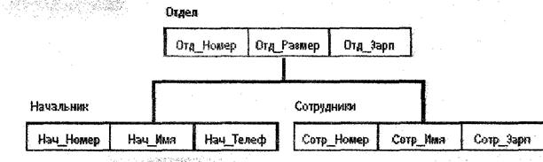 Здесь Отдел является предком для Начальник и Сотрудники, а Начальник и Сотрудники - потомки Отдел. Между типами записи поддерживаются связи. Ограничения целостности