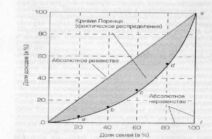 Для графической иллюстрации степени неравномерности в распределении доходов строится кривая Лоренца (рис. 42), по которой также можно рассчитать коэффициент Джини как отношение площади между линиями равномерного и фактического распределения к площади треугольника oef.