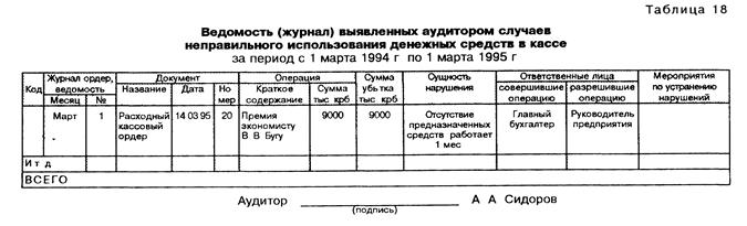 Для облегчения работы, раскрытия возможных случаев злоупотреблений и нарушений по данным первичной бухгалтерской документации целесообразно использовать специальную ведомость аудита хранения денежных средств в кассе (табл. 16).