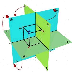 Плоскости проекций, попарно пересекаясь, определяют три оси 0x, 0y и 0z, которые можно рассматривать как систему декартовых координат в пространстве с началом в точке 0.
