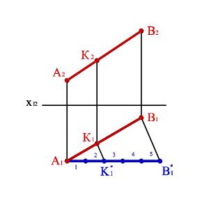 Соединить точку В*1 с точкой В1 и проведя из точки К*1 прямую параллельную (В1В*1) получим проекцию точки К1. Согласно теореме Фалеса (Если на одной стороне угла отложить равные отрезки и через их концы провести параллельные прямые, пересекающие другую сторону, то на другой стороне отложатся равные между собой отрезки) А1К1/К1В1=2/3, далее находим К2. Таким образом проекции точки К делят одноименные проекции отрезка АВ в данном отношении следовательно и точка К делит отрезок АВ в отношении 2/3.