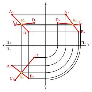 Особый случай представляют собой прямые, параллельные одной из плоскостей проекций. Например, фронтальные и горизонтальные проекции профильных прямых параллельны, но для оценки их взаимного положения необходимо сделать проекцию на профильную плоскость проекций (рис. 24). В рассмотренном случае проекции отрезков на плоскость П3 пересекаются, следовательно, они не параллельны.