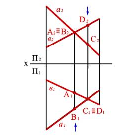 Точке пересечения фронтальных проекций прямых (рис. 28) соответствуют две точки А и В, из которых одна принадлежит прямой а, другая в. Их фронтальные проекции совпадают лишь потому, что в пространстве обе точки А и В находятся на общем перпендикуляре к фронтальной плоскости проекций. Горизонтальная проекция этого перпендикуляра, обозначенная стрелкой, позволяет установить, какая из двух точек ближе к наблюдателю. На предложенном примере ближе точка В лежащая на прямой в, следовательно, прямая в проходит в этом месте ближе прямой а и фронтальная проекция точки В закрывает проекцию точки А. (Для точек С и Д решение аналогично).