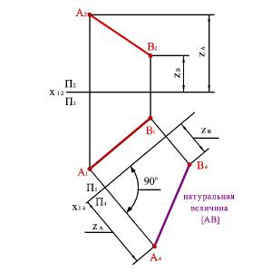 Выберем новую плоскость проекций П4, параллельно отрезку АВ и перпендикулярно плоскости П1. Введением новой плоскости, переходим из системы плоскостей П1П2 в систему П1П4, причем в новой системе плоскостей проекция отрезка А4 В4 будет натуральной величиной отрезка АВ.