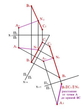 Рисунок 37. Определение расстояния от точки до прямой общего положения методом замены плоскостей проекций