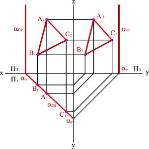 Следы плоскости общего положения пересекаются попарно на осях в точках ax,ay,az. Эти точки называются точками схода следов, их можно рассматривать как вершины трехгранных углов, образованных данной плоскостью с двумя из трех плоскостей проекций.