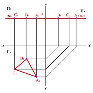 3.3. Профильная плоскость - плоскость параллельная профильной плоскости проекций (a//П3), (a^П1, a^П2). Любая фигура в этой плоскости проецируется на плоскость П3 без искажения, а на плоскости П1 и П2 в прямые - следы плоскости aП1 и aП2 (рис.48).