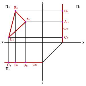 2.3. Плоскость перпендикулярная профильной плоскости (a^П3) - профильно проецирующая плоскость. Частным случаем такой плоскости является биссекторная плоскость (рис.45).