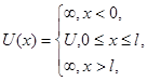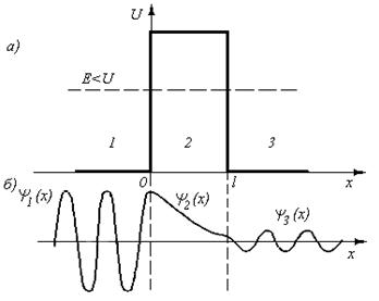 Рассмотрим потенциальный барьер простейшей прямоугольной формы (рис. 4, а) для одномерного (по оси х) движения частицы. Для потенциального барьера прямоугольной формы высоты U и ширины l можно записать