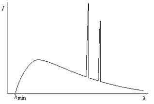 Исследование спектрального состава рентгеновского излучения показывает, что его спектр имеет сложную структуру (рис. 11) и зависит как от энергии электронов, гак и от материала анода. Спектр представляет собой наложение сплошного спектра, ограниченного со стороны коротких длин волн некоторой границей λmin, называемой границей сплошного спектра, и линейчатого спектра – совокупности отдельных линий, появляющихся на фоне сплошного спектра.