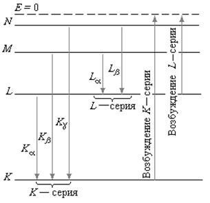 Механизм возникновения рентгеновских серий показан на рис. 12. Под влиянием внешнего электрона или высокоэнергетического фотона вырывается один из двух электронов K -оболочки атома. Тогда на его место может перейти электрон с более удаленных от ядра оболочек L, М, N,.... Такие переходы сопровождаются испусканием рентгеновских квантов и возникновением спектральных линий K -серии: Кα. (L→К), Кβ (М→К), Kγ (N→К) и т. д. Самой длинноволновой линией K -серии является линия Ка. Частоты линий возрастают в ряду Kα →Kβ →Kγ, поскольку энергия, высвобождаемая при переходе электрона на K -оболочку с более удаленных оболочек, увеличивается. Наоборот, интенсивности линий в ряду Kα →Kβ →Kγ убывают, так как вероятность переходов электронов с L -оболочки на K -оболочку больше, чем с более удаленных оболочек М и N. K -серия сопровождается обязательно другими сериями, так как при испускании ее линий появляются вакансии в оболочках L, М,..., которые будут заполняться электронами, находящимися на более высоких уровнях.