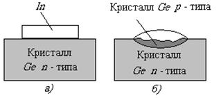 Граница соприкосновения двух полупроводников, один из которых имеет электронную, а другой – дырочную проводимость, называется электронно-дырочным переходом (или р-п- переходом). Эти переходы имеют большое практическое применение, являясь основой работы многих полупроводниковых приборов. р - п -переход нельзя осуществить просто механическим соединением двух полупроводников. Обычно области различной проводимости создают либо при выращивании кристаллов, либо при соответствующей обработке кристаллов. Например, на кристалл германия п -типа накладывается индиевая «таблетка» (рис. 27, а). Эта система нагревается примерно при 500 °С в вакууме или в атмосфере инертного газа; атомы индия диффундируют на некоторую глубину в германий. Затем расплав медленно охлаждают. Так как германий, содержащий индий, обладает дырочной проводимостью, то на границе закристаллизовавшегося расплава и германия п -типа образуется р-п -переход (рис. 27, б).