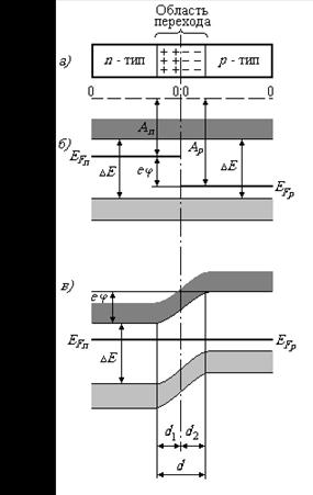 В п -полупроводнике из-за ухода электронов вблизи границы остается некомпенсированный положительный объемный заряд неподвижных ионизованных донорных атомов. В р -полупроводнике из-за ухода дырок вблизи границы образуется отрицательный объемный заряд неподвижных ионизованных акцепторов (рис. 28, а). Эти объемные заряды образуют у границы двойной электрический слой, поле которого, направленное от п -области к р -области, препятствует дальнейшему переходу электронов в направлении п→ р и дырок в направлении р → п. Если концентрации доноров и акцепторов в полупроводниках п - и р -типа одинаковы, то толщины слоев d 1, и d 2 (рис. 28, в), в которых локализуются неподвижные заряды, равны (d 1 = d 2).