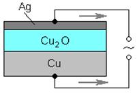 Принципиальная схема плоскостного меднозакисного (купроксного) выпрямителя дана на рис. 32. На медную пластину с помощью химической обработки наращивается слой закиси меди Cu2O, который покрывается слоем серебра. Серебряный электрод служит только для включения выпрямителя в цепь. Часть слоя Cu2O, прилегающая к Cu и обогащенная ею, обладает электронной проводимостью, а часть слоя Cu2O, прилегающая к Аg и обогащенная (в процессе изготовления выпрямителя) кислородом, - дырочной проводимостью. Таким образом, в толще закиси меди образуется запирающий слой с пропускным направлением тока от Cu2O к Cu (р→п).