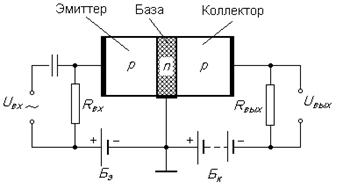 Прикладывая между эмиттером и базой переменное напряжение, получим в цепи коллектора переменный ток, а на выходном сопротивлении переменное напряжение. Величина усиления зависит от свойств р - п -переходов, нагрузочных сопротивлений и напряжения батареи Бк. Обычно R вых >> R вх,поэтому U вых значительно превышает входное напряжение U вх (усиление может достигать 10 000). Так как мощность переменного тока, выделяемая в R вых, может быть больше, чем расходуемая в цепи эмиттера, то транзистор дает и усиление мощности. Эта усиленная мощность появляется за счет источника тока, включенного в цепь коллектора.