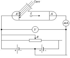 Первые фундаментальные исследования фотоэффекта выполнены русским ученым А. Г. Столетовым. Принципиальная схема для исследования фотоэффекта приведена на рис. 42. Два электрода (катод К из исследуемого металла и анод А — в схеме Столетова применялась металлическая сетка) в вакуумной трубке подключены к батарее так, что с помощью потенциометра R можно изменять не только значение, но и знак подаваемого на них напряжения. Ток, возникающий при освещении катода монохроматическим светом (через кварцевое окошко), измеряется включенным в цепь миллиамперметром. Облучая катод светом различных длин волн, Столетов установил следующие закономерности, не утратившие своего значения до нашего времени: