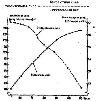 У людей примерно одинаковой тренированности, но разного веса абсолютная сила с увеличением веса возрастает, а относительная падает (рис.).; Аналогичные закономерности наблюдаются и в I отношении некоторых других функциональных