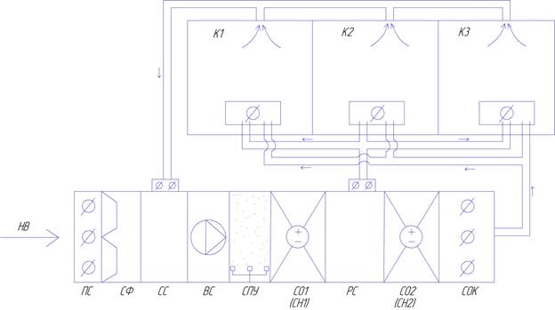 Наружный воздух после очистки в секции фильтров смешивается с внутренним воздухом из помещения в секции смешения СС. После смешивания воздух проходит первый воздухонагреватель или первый воздухоохладитель.