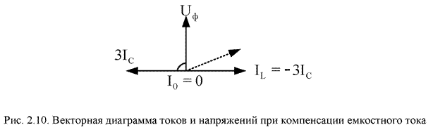 Так как индуктивный ток и емкостный направлены противоположно, то они будут компенсировать друг друга, и дуга погаснет (рис. 2.10).
