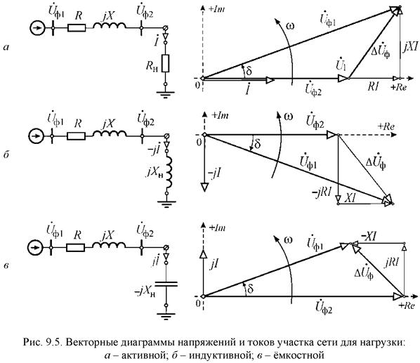 Характер нагрузки влияет на изменение напряжений в начале и конце звена. На рис. 9.5 приведены векторные диаграммы фазных напряжений и токов участка сети с активно-индуктивным сопротивлением для активной (рис. 9.5, а), индуктивной (рис. 9.5, б) и емкостной (рис. 9.5, в) нагрузки I. Анализ данных частных случаев позволяет установить граничные состояния напряжений участка реальной сети, в пределах которых находятся наиболее распространенные общие случаи загрузки сети. Так, например, при активно-индуктивной нагрузке во всех случаях (при изменении cos