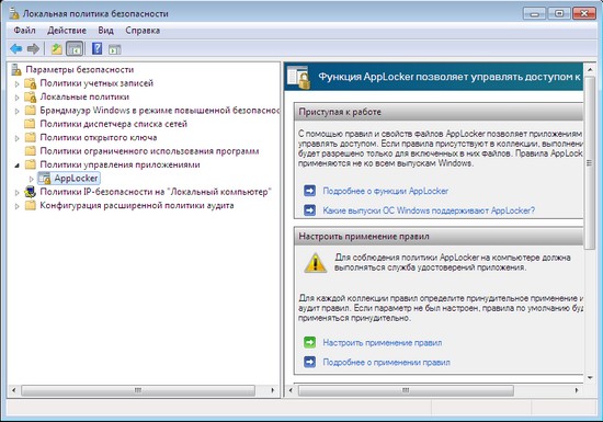 В предыдущих версиях Windows была возможность решения этой задачи при помощи политик ограниченного использования программ (Software Restriction Policies), однако этот инструмент был настолько неудобен и несовершенен, что мало кто воспринимал его всерьез. В Windows 7 функция политик ограниченного использования программ заменена средством AppLocker, которое, по сути, представляет собой измененную и доработанную версию Software Restriction Policies.
