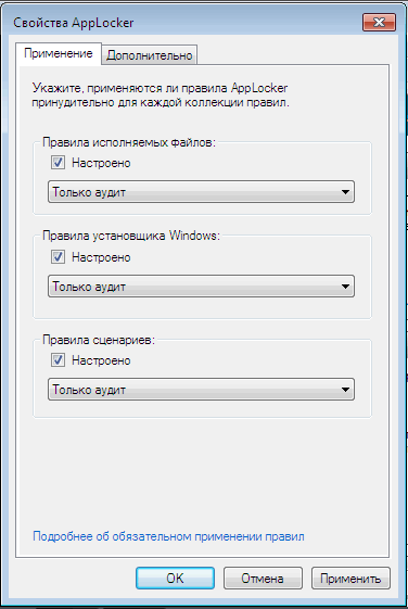 Одна из особенностей AppLocker состоит в том, что по умолчанию все правила, настроенные при помощи этого средства, применяются. Именно поэтому необходимо очень осторожно настраивать их, так как можно по неопытности заблокировать работу Windows. Во-первых, рекомендуется перед созданием правил перейти в окно их настройки, щелкнув по ссылке "Настроить применение правил" (Configure Rule Enforcement), и для каждого типа правил (исполняемые файлы, установщик Windows и сценарии) выбрать вариант применения "Только аудит" (Audit Only). В этом случае правила с любыми настройками не смогут блокировать работу приложений или системы в целом, однако при помощи журнала событий администратор сможет просмотреть, как они применяются по отношению к файлам или приложениям. Если окажется, что правила блокируют приложения, к которым доступ должен быть разрешен, или, наоборот, не действуют на программы, к которым нужно ограничить доступ, правила можно будет отредактировать.