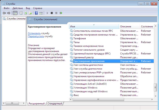 Для применения правил, созданных при помощи AppLocker, необходимо, чтобы на компьютерах была запущена служба "Удостоверение приложения" (Application Identity). По умолчанию она отключена. Для ее запуска откройте раздел "Администрирование" панели управления и выберите пункт "Службы", после чего найдите службу в списке, щелкните по ее названию правой кнопкой мыши и выберите команду "Запустить". В свойствах службы можно настроить ее автоматический запуск.