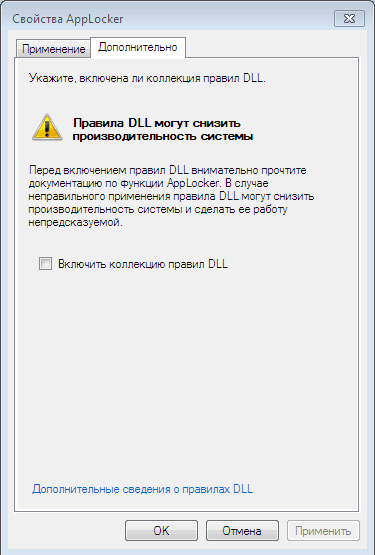 По умолчанию в AppLocker используется три типа (коллекции) правил, которые настраиваются и используются независимо друг от друга: исполняемые файлы (EXE и COM), установщик Windows (MSI и MSP) и сценарии (PS1, BAT, CMD, VBS и JS), однако при необходимости можно также включить правила для файлов библиотек DLL (сюда входят и файлы с расширением OCX). Для этого нужно установить флажок "Включить коллекцию правил DLL" (Enable the DLL rule collection) на вкладке "Дополнительно" (Advanced) окна "Свойства AppLocker" (AppLocker Properties).