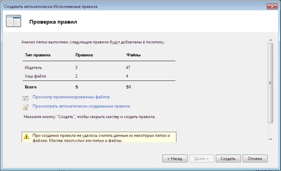 После завершения работы мастера автоматического создания правил AppLocker выдает отчет, в котором выводит общее количество файлов и число правил, которые будут созданы. Перед созданием правил есть возможность просмотреть как проанализированные файлы, так и составленные правила.