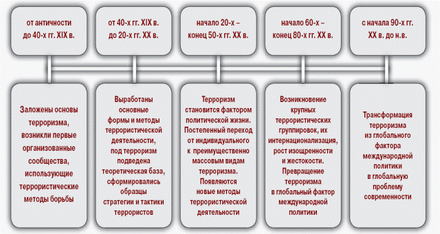 Контуры современного терроризма возникли в начале 60-х гг. прошлого столетия после распада ведущих колониальных империй. Борьба за национальное освобождение нередко велась военными средствами, и террористические акции являлись одной из форм партизанских действий. Однако по мере изменения геополитической обстановки в мире стал претерпевать коренные изменения и терроризм. К концу XX в. масштабные террористические акты превратились в распространенное средство достижения политических целей. Значительно изменились характер и тактика террористической деятельности. Так, если в 60-х годах XX в. наибольшее распространение в мире получили захваты воздушных судов, то в 70-х число захватов самолетов резко сократилось. Террористы стали чаще прибегать к тактике совершения взрывов, похищений людей и убийств государственных деятелей.