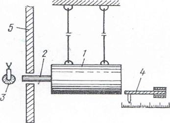 Рис.2. Баллистический маятник: 1 - тело маятника; 2 - носок маятника; 3 - заряд ВВ; 4 - измеритель отклонений; 5 - защитный экран. |