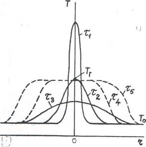 Рис.4. Температурное поле вокруг ИЗ (г - расстояние в разное время т) |