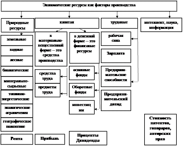 2. Экономические ресурсы как факторы производства. Источники любого производства – это экономические ресурсы или факторы производства, которые в экономической науке объединены в 4 группы: природные ресурсы, созданные природой; капитал, т.е. материальные объекты и финансовые ресурсы, созданные людьми; трудовые ресурсы; научные, интеллектуальные и информационные ресурсы (рис. 2.1).