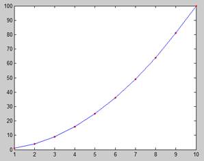 • plot(X1,Y1,S1,X2,Y2,S2,X3,Y3,S3,…) – эта команда строит на одном графике ряд линий, представленных данными вида (Xi,Yi,Si), где Xi и Yi – векторы или матрицы, а Si – строки. С помощью такой конструкции возможно построение, например, графика функции линией, цвет которой отличается от цвета узловых точек. Так, если надо построить график функции линией синего цвета с красными точками, то вначале надо задать построение графика с точками красного цвета (без линии), а затем графика только линии синего цвета (без точек).