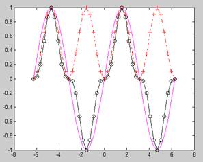 Рис. 6.2. Пример работы команды plot с заданием маркеров и цвета и типа линий