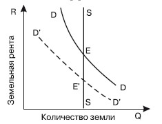 Если рента превышает равновесную цену, то объем спроса на землю со стороны фирм будет меньше существующего объема предложения земли. Некоторые собственники земли не смогут сдать в аренду свою землю, что вынудит их пойти на более низкую ренту. Если рента будет ниже своей равновесной величины, то увеличившийся спрос на землю со стороны фирм приведет к возвращению факторной цены в равновесное состояние.