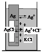 В электролите поддерживается постоянная концентрация ионов Ag+ за счет растворимости хлорида серебра. В присутствии растворимой соли KCl концентрация Ag+ определяется уравнением